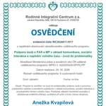 • Podpora osob s PAS a MP v oblasti komunikace, sociální interakce a naplnění volného času – úvod do problematiky s akreditací číslo: MPSV č. A2025/0429-SP/PC/PP pod vedením lektorky Ing. Eva Černá, PhD. • webináře pod záštitou organizace Society for All (ČOSIV): Jak podpořit socio-emoční dovednosti u dětí, Poruchy příjmu potravy, Stres, Systémové ukotvení prevence v podpoře ohrožených dětí, Reakce na téma sebepoškozování, Úzkost • účast na překladatelské soutěži v německém, anglickém a latinském jazyce (FF OU) • úspěšně zakončený vysokoškolský předmět: Speciální pedagogika